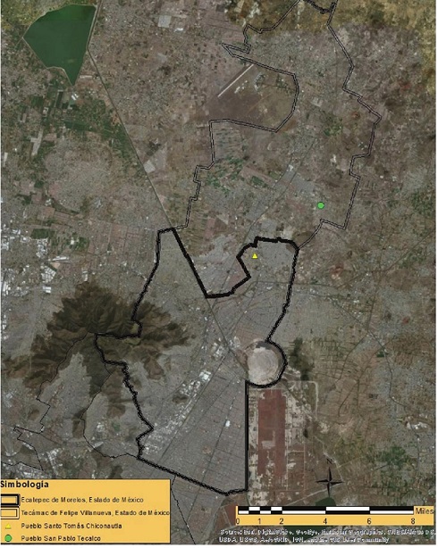 Se analizan de manera particular los casos de los pueblos Santo Tomás Chiconautla y San Pablo Tecalco, ubicados al nororiente de la metrópoli de la Ciudad de México, en los municipios de Ecatepec de Morelos y Tecámac de Felipe Villanueva, respectivamente, en el Estado de México. En términos generales, éstos comparten con otros pueblos características identitarias similares: a) son asentamientos históricos de origen indígena en su composición socioétnica;4b) fueron dotados con tierra ejidal, o bien restituida la tierra comunal durante el periodo posrevolucionario; c) tienen comités de agua autónomos que administran los recursos acuíferos del pueblo para sus habitantes y sólo en ciertos casos abastecen a los asentamientos de su entorno; y d) se encuentran en el primero y segundo anillos de conurbación de la metrópoli de la Ciudad de México.