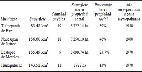 En varios de estos municipios, los nuevos asentamientos de población urbana se establecieron en torno (colindando con, o incorporando) a los pueblos originarios,2 quienes históricamente habían ocupado el territorio para su asentamiento, a través de fundos legales heredados desde la época colonial,3 y aprovechando los derechos adquiridos con el establecimiento de la propiedad social que les fuera dotada y/o restituida con la Reforma Agraria de inicios del siglo XX.
