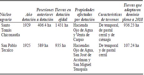 Mención aparte es la que tiene que ver con las tierras cuyo origen es de propiedad social, ya que en los dos pueblos se conformaron núcleos agrarios a partir de la Reforma Agraria de 1915 (véase el Cuadro 4), que han presentado comportamientos diferenciados después de la reforma constitucional al artículo 27 de 1992, lo que desencadenó la apertura de un mercado de tierras periurbanas para la instalación de conjuntos habitacionales en dicha tierra de origen social.