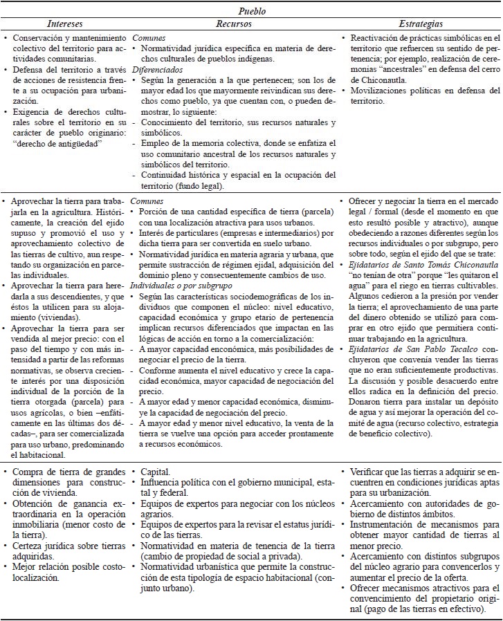 Es importante destacar esto último, sobre todo porque en algunos casos se ha confundido al pueblo y al núcleo agrario como un sólo actor, incluso porque en su mayoría los núcleos agrarios tienen el mismo nombre que el pueblo (López, 2017). Sin embargo, estos nuevos escenarios que se desarrollan alrededor de la mercantilización legal de las tierras originalmente ejidales para la ocupación urbana, han permitido visibilizar la diferencia entre estos dos actores.