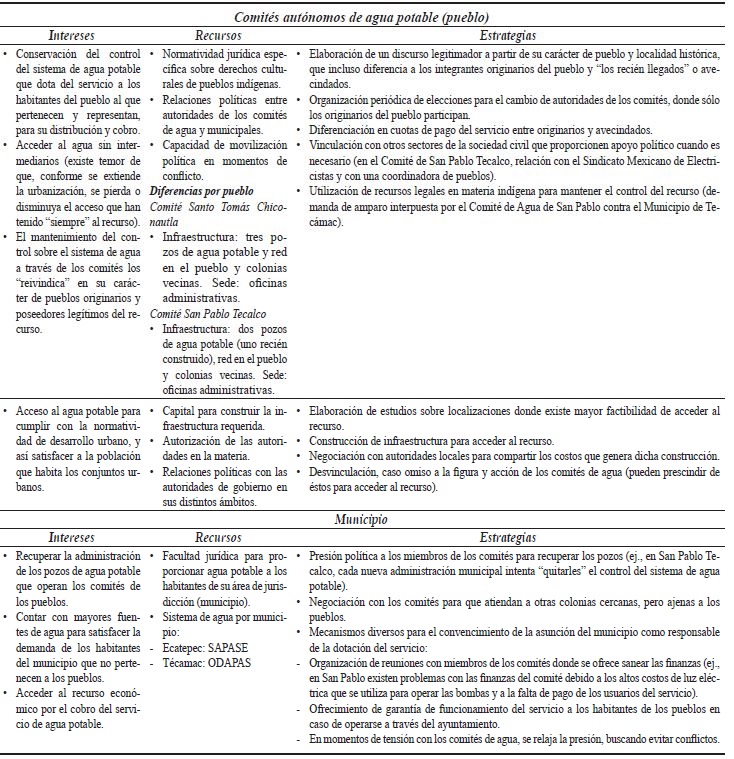 De la misma manera que en el análisis de actores en torno a la tierra, en el Cuadro 6 se pretende exponer las lógicas de acción de los actores en torno al agua, esquematizadas en la identificación de intereses, recursos y estrategias por cada actor. A diferencia de lo observado con el recurso tierra, aquí pudo advertirse una mayor homogeneidad de comportamientos, derivada, quizás, de una menor diferenciación dentro de cada actor colectivo.