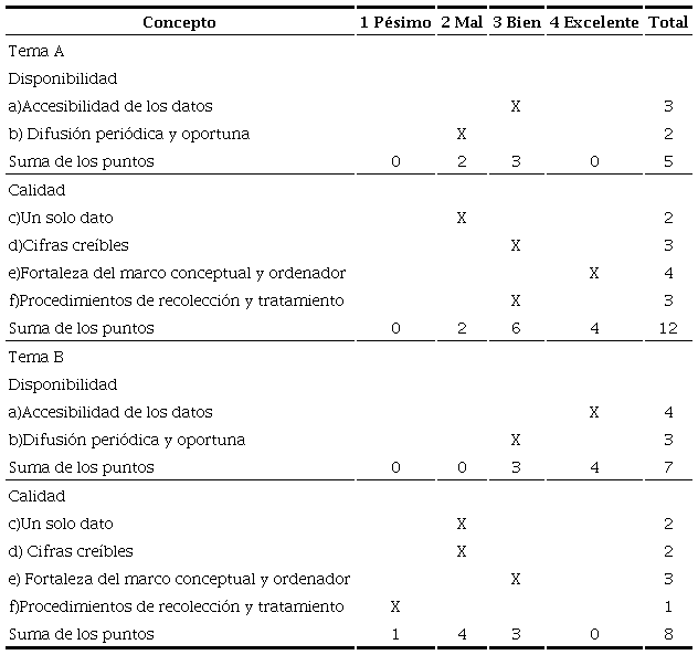 En la evaluación de las estadísticas sobre la contaminación ambiental por cada uno de los temas seleccionados, se consideran observaciones documentadas de los criterios ya explicados, siguiendo una escala de Likert (1932).6 Así, se juzga la forma en que se procede para aplicar cada uno de estos criterios, considerando las siguientes cuatro opiniones: a) pésimo, b) mal, c) bien, y d) excelente. En esta escala, se otorga una calificación de 1 a la primera opinión, 2 a la segunda, 3 a la tercera y 4 a la última.7 El método tiene cierto grado de subjetividad, lo cual se tratará de minimizar.8 Siguiendo los lineamientos descritos, se llena un formato como el que se presenta en el Cuadro 1, por tema e indicando la opinión sobre cada criterio. Como ejemplo, se presenta en dicho cuadro la evaluación de dos temas. En el tema A se juzga que en la accesibilidad se ha procedido “bien”, en tanto que la periodicidad con oportunidad se opina que se hace “mal”, y se asignan sus respectivos puntos de calificación.