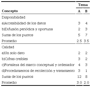 En el mismo se aprecia que el tema B es mejor evaluado que el A en cuanto a la disponibilidad (un promedio de 3.5 puntos, en comparación con el de calidad, 2.5), pero es peor evaluado que el tema A en lo referente a la calidad (2 contra 3). Un cuadro de resumen como éste es el que se construirá aquí para cada uno de los temas seleccionados.