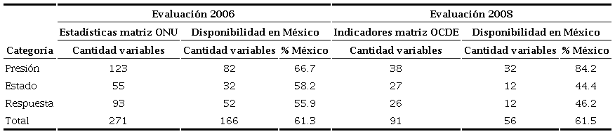 Los antecedentes sobre el estado que han guardado la disponibilidad y la calidad de las estadísticas en México son de hace una década. El Instituto Nacional de Estadística y Geografía (INEGI) ha llevado a cabo varias revisiones y evaluaciones de sus estadísticas: en los años 2006, 2008 y 2012. Las dos primeras evaluaciones se llevaron a cabo siguiendo las directrices de los marcos conceptuales y categorías de información de las Naciones Unidas y la OCDE. Se detectaron rezagos en la disponibilidad, al calcularse que la generación de datos ambientales equivalía a 61% del total ofrecido por la matriz de estadísticas del tema en dichos organismos internacionales. De las categorías del marco ordenador presión-estado-respuesta (PER),9 los mayores rezagos se encontraban en las categorías de estado y respuesta; no tanto en la de presión (véase el Cuadro 3).