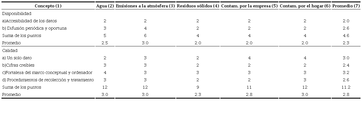 La estadística sobre la contaminación de las empresas tiene en promedio una evaluación de haber procedido “mal” en la disponibilidad. En cuanto a la calidad, resulta casi “bien”, siendo sus debilidades la credibilidad de las cifras, la periodicidad con oportunidad de su difusión y los procedimientos de recolección y tratamiento (en especial, hay irregularidades de registros) (véase la columna 5 del Cuadro 4).