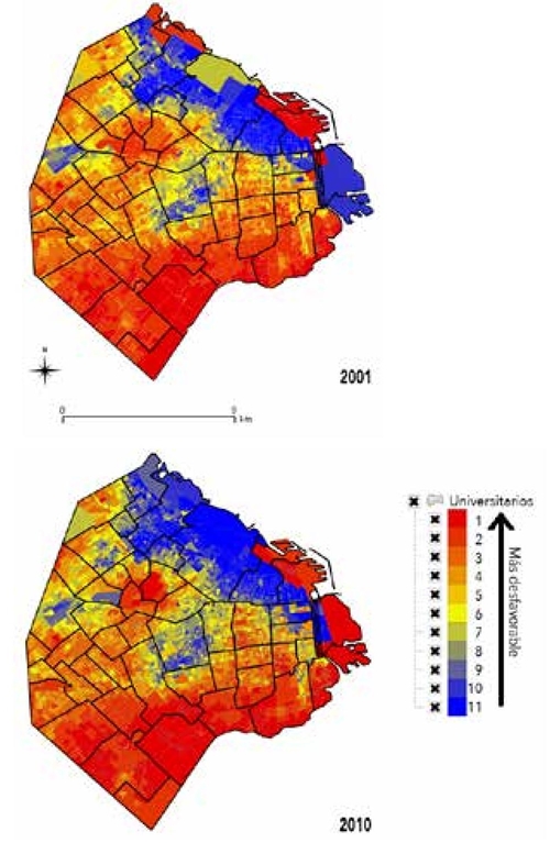 Los Mapas 1 y 2 ofrecen la representación cartográfica de la evolución 2001-2010 de los dos indicadores guía, a partir de los 11 percentiles de desvíos respecto a la media. Esta secuencia permite identificar grandes conglomerados de radios de valores altos y bajos para ambos indicadores, que coinciden a grandes rasgos con los macrosectores privilegiados y empobrecidos de la ciudad.