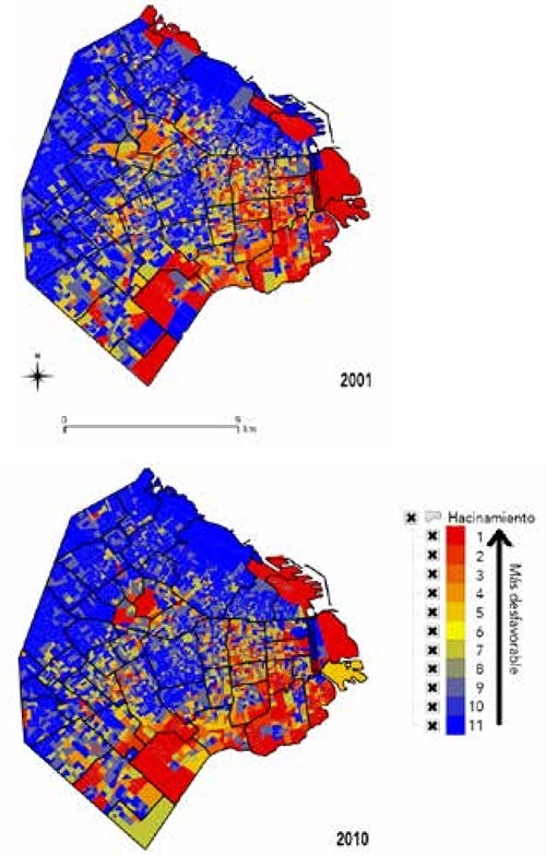 En cuanto al indicador habitacional, se eligió trabajar con el hacinamiento (porcentaje de hogares con tres o más personas por cuarto). Los censos utilizados (2001 y 2010) no proporcionan información adecuada sobre el estado de la edificación o sobre el precio del metro cuadrado, alternativas que hubieran resultado interesantes. Esto supone el inconveniente de no poder contar con un indicador de la inversión en el parque residencial. De todas maneras, a nivel teórico, si la variable de la proporción de universitarios nos indica el peso de las clases medias, el hacinamiento incluye la dimensión de la habitabilidad (en concreto, la relación entre tamaño del hogar y la vivienda), y ha demostrado una capacidad histórica para dar cuenta de los cambios sociohabitacionales en la ciudad, identificando el peso de estratos sociales bajos, que en el contexto porteño están históricamente vinculados a este tipo de precariedad habitacional (Torres, 1978, 2001, 2006).