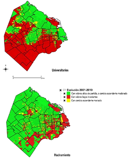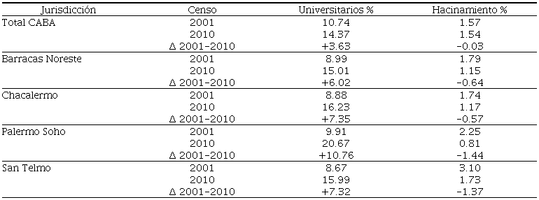 Los indicadores guía sobre gentrificación serían entonces la variación intercensal (2001-2010) de estas variables a nivel de radio censal,2 a la luz de su comportamiento y evolución general dentro del conjunto de la ciudad (i. e., considerando la tendencia general urbana hacia el incremento del porcentaje de universitarios o hacia la baja gradual de los niveles de hacinamiento).