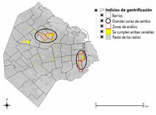 Los cuatro grandes conglomerados identificados con indicios de gentrificación, según la metodología desarrollada, coinciden con buena parte de la bibliografía científica sobre el desarrollo urbano de la urbe. Los barrios de San Telmo y Barracas forman parte de los sectores en el centro sur de la ciudad donde se ha concentrado la mayor parte de la inversión pública desde la década de los noventa, en gran medida orientada a provocar procesos de renovación urbana (Herzer, 2008). Mientras, Palermo Soho y algunos sectores limítrofes han sufrido una conocida valorización como zona residencial de estatus alto y enclave comercial y de ocio nocturno (Carbajal, 2003).