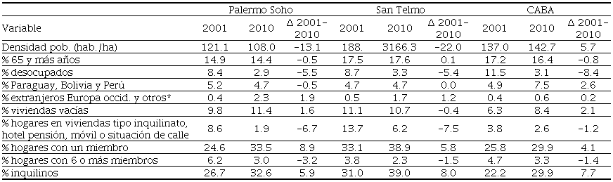 A nivel sociodemográfico, la gentrificabilidad puede estar vinculada a una mayor susceptibilidad al desplazamiento de la población de bajos recursos o a algunas características del parque de viviendas que faciliten la entrada de nueva población. No obstante, al compararlos con el dato del conjunto de la ciudad, la mayor parte de los indicadores de vulnerabilidad de población no resultan significativos. San Telmo contaba en 2001 con un envejecimiento próximo al del conjunto de la ciudad y un dato similar de población extranjera procedente de Paraguay, Perú y Bolivia, mientras el dato de desempleo y de hogares con más de seis miembros eran considerablemente inferiores a los del conjunto de la urbe. Estos dos últimos datos sí eran algo superiores en Palermo Soho, sin llegar a suponer una desviación demasiado notable con respecto al dato del conjunto de la ciudad. Sí resulta más significativo el dato del porcentaje de personas que viven en viviendas inadecuadas (inquilinatos, pensiones, móviles y situación de calle), cuatro puntos y medio superior a la media urbana en Palermo Soho y casi diez puntos más alto en San Telmo. Por supuesto, el descenso de este dato en el periodo intercensal ha sido enorme en los dos casos de estudio.
