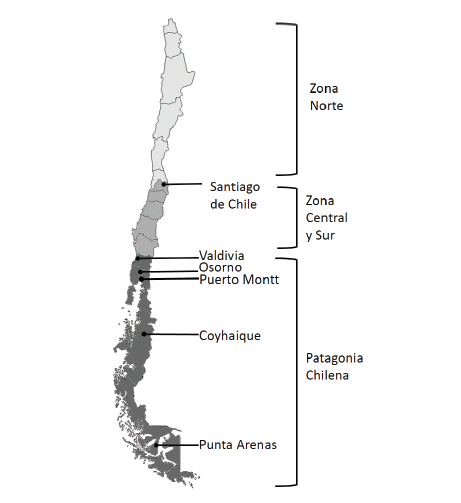 La Patagonia es parte de América del Sur y se divide en la occidental, que pertenece a Chile, y la oriental, que corresponde a Argentina. Para el caso chileno, es posible encontrar autores que fijan el límite norte en distintos puntos. El más septentrional es situado por los historiadores Enrique Campos Menéndez y Raúl Rey Balmaceda en el norte de la ciudad de Valdivia (Said, 2012), a partir del paralelo 39°49’ (véase el Mapa 1).