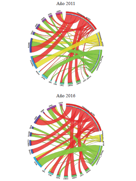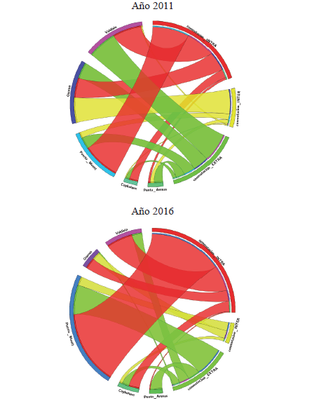 Una forma de ver la gráfica y sus categorías es leerla en el sentido de las agujas del reloj. Por ejemplo, si se observa la conmutación intrarregional (para los años 2011 y 2016), la primera cinta de esta categoría se vincula con Puerto Montt, lo que quiere decir que el mayor flujo de conmutantes de este tipo va hacia ese centro nodal. Por otra parte, si se observa a Puerto Montt, coincide con que la primera cinta que llega hacia dicho centro nodal corresponde a los conmutantes del tipo intrarregionales. En cambio, para el caso de Osorno en el año 2011, el primer flujo de conmutantes correspondía a los de tipo interregional, es decir, los que provienen desde otras regiones de la misma Patagonia.