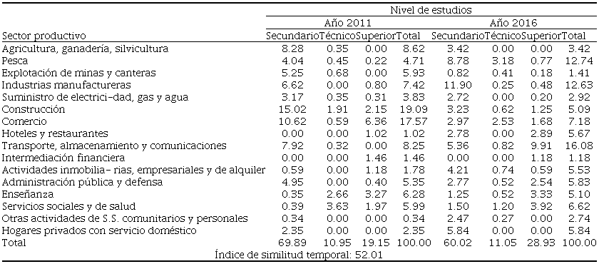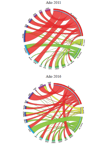 Concretamente, para 2011 se observa que el flujo de conmutantes con estudios técnicos y superiores se orienta a actividades productivas del tipo terciario (65.8 y 81.8% respectivamente), mientras que en el año 2016 destaca que, de aquellos que poseen estudios superiores, el 90% se orienta hacia sectores terciarios. Para el caso de los conmutantes ocupados con estudios técnicos, se observa un importante incremento porcentual de trabajadores que van hacia sectores primarios (pasan de 13.5 a 32.5%). Desde la perspectiva del tipo de la cualificación, se puede mencionar al sector de intermediación financiera (11IN en la gráfica), ya que el 100% de los conmutantes poseen estudios superiores en ambos periodos.