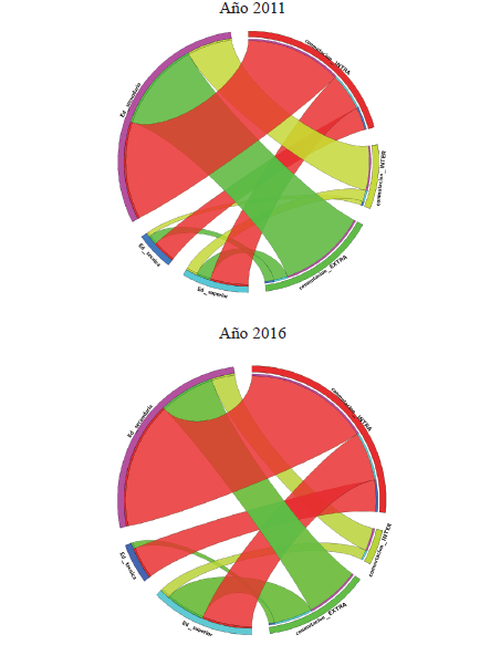 Para una mejor compresión y análisis, se construirán gráficos circulares para visualizar los flujos de conmutación y su distribución entre variables o dimensiones de análisis. Para lo anterior, se utiliza la herramienta desarrollada por Krzywinski, Schein, Birol, Connors, Gascoyne, Horsman, Jones y Marra (2009), que originalmente fue propuesta para investigaciones en el área de la genética. Uno de los primeros trabajos en utilizar estos gráficos para flujos migratorios es el de Abel y Sander (2014), quienes los introducen para exponer sus análisis de 196 países, y con ello exponer fácilmente los resultados y conclusiones.