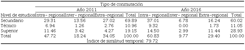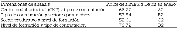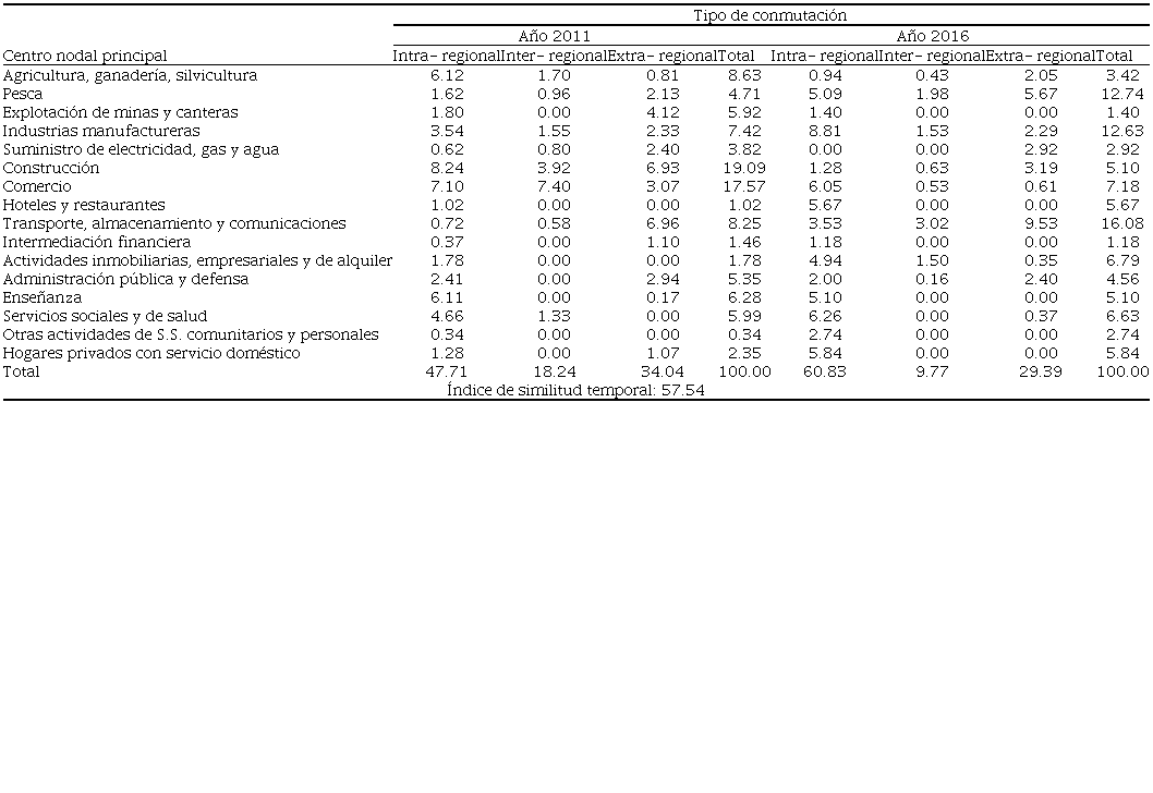 El Cuadro 5 proporciona los resultados de los valores del índice de similitud para las cuatro dimensiones de análisis o cruces entre variables. Los valores para calcular el índice se encuentran en los anexos, y en el cuadro señalado se especifica la ubicación de ellos. Considérese el resultado del índice de similitud temporal para el CNP y el tipo de conmutación como ejemplo para comprender el análisis del índice. El resultado indica que entre los años 2011 y 2016 existió 66.27% de similitud entre la forma en cómo se distribuyen los conmutantes entre los centros nodales y el tipo de conmutación que realizan (sea ésta de tipo intrarregional, interregional o extrarregional). Desde el cuadro se observa que la dimensión que incluye el nivel de formación de los conmutantes (educación secundaria, técnica o profesional) y el sector productivo es la que más cambios experimentó, ya que su índice es de 52.01, correspondiendo a la distribución de los conmutantes entre variables que menos se parece entre los años. Del lado contrario, la distribución entre el tipo de conmutantes y el nivel de formación tiene el más alto parecido (índice de 79.72) entre los dos periodos. En lo que sigue de la presente sección de resultados, se proporcionan más detalles de las dimensiones aquí mencionadas.