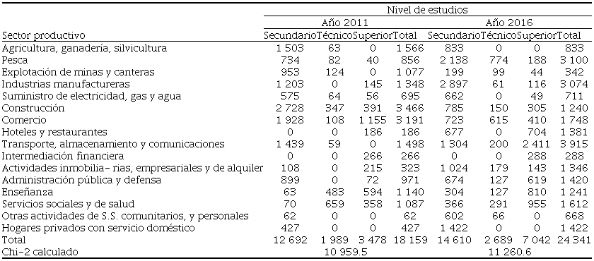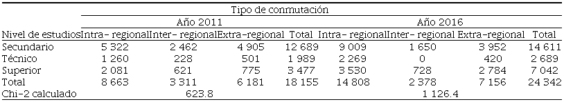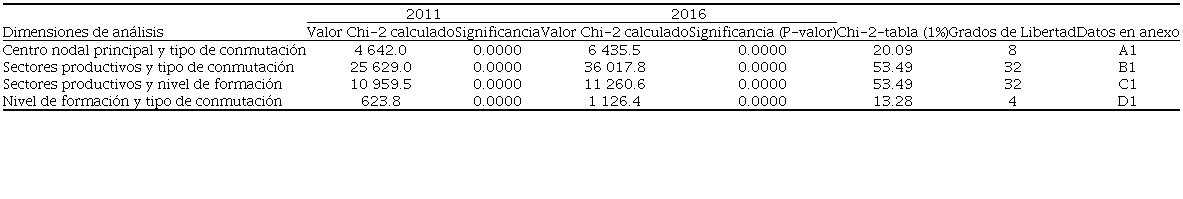Un tercer procedimiento consiste en determinar las diferencias en la distribución de conmutantes entre el año 2011 y el 2016, considerando las variables de centro nodal principal, sector productivo, tipo de conmutación (intra, inter y extrarregional) y nivel de formación. Ya que sólo se podrá establecer un cruce entre dos variables, a cada análisis cruzado o de tabla de contingencia se le denominará dimensión de análisis.