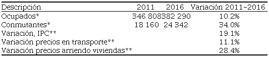 En lo que sigue, en primer lugar, se proporcionan algunos antecedentes específicos para entender el fenómeno de la conmutación en el periodo de análisis, tal como los precios del transporte y la vivienda, además de las cifras de desocupación en el territorio de estudio. Posteriormente, se describen características de los tipos de conmutantes de acuerdo a los datos del año 2016 y se identifican diferencias estadísticas entre ellos. Finalmente, se caracteriza a la conmutación por medio de la metodología propuesta, esto es, haciendo uso del índice de similitud intertemporal, las tablas de contingencia y los gráficos circulares de Krzywinski et al. (2009).