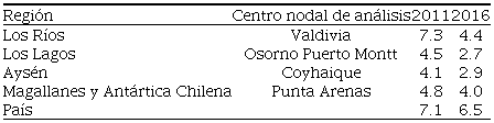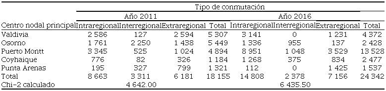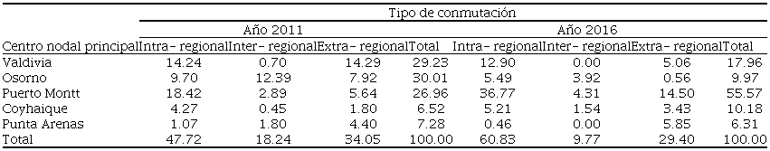 Pino, Concha y Fuentes (2016) indican que la conmutación laboral en Chile creció entre 2011 y 2014 en 23%. Considerando los cálculos propios de los autores de este trabajo, y en conformidad con la Encuesta Suplementaria de Ingresos (ESI) del Instituto Nacional de Estadísticas de Chile (INE), se observa en las regiones (primera división política administrativa) de la Patagonia que el total de ocupados en los centros nodales principales (CNP) aumentó 10.2% entre los años 2011 y 2016, mientras que los conmutantes laborales hacia los CNP crecieron en 34%.