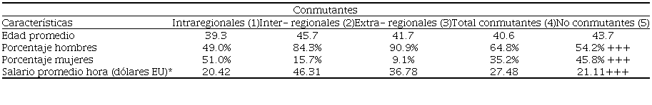 Las características generales de los conmutantes se pueden encontrar en el Cuadro 3, en el que se detallan los tres tipos de conmutantes definidos: los intra, inter y extrarregionales, así como las características de los no conmutantes de los centros nodales. Desde el punto de vista de la edad promedio, aparentemente no existen diferencias entre los conmutantes y no conmutantes (columnas 4 y 5). Sin embargo, en un análisis comparado entre grupos, se puede identificar que los conmutantes intrarregionales, es decir aquellos que conmutan dentro de la misma región, son efectivamente más jóvenes que todos los demás grupos (p-valor entre 0.06 y 0.002). Con los datos utilizados no es posible hacer una mayor inferencia de los datos, pero es plausible pensar que los individuos de menor edad promedio tienen menos experiencia laboral y generalmente están en una etapa de desarrollo individual donde el acceso a la vivienda es un anhelo personal y familiar, además de que, dados los antecedentes anteriores, ésta es más costosa en el periodo. Así, hipotéticamente, la conmutación vendría a solucionar la necesidad de trabajo y compatibilizar el acceso a la vivienda.