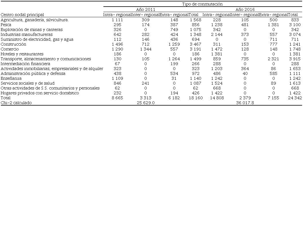 Los resultados de la prueba Chi-2 también permiten indicar que existe una asociación entre las variables, es decir, algún tipo de conmutación está más asociada a un tipo de sector económico. Se aprecia, para el año 2011, que los principales sectores productivos que más conmutantes reciben son construcción (19.1%) y comercio (17.6%), cuyos principales flujos de conmutantes correspondían a intrarregionales (47.6 y 43.1% respectivamente); sin embargo, en el año 2016 el principal flujo de conmutantes en el sector construcción provenía desde fuera de la Patagonia (62.6%), y el sector comercio aumentó considerablemente la proporción de conmutantes intrarregionales a 84.2%.