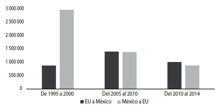 La población mexicana en Estados Unidos había logrado conformarse por una comunidad de más de 11.5 millones de personas hacia 2015, de las cuales, alrededor de 54.9% eran niños y jóvenes de 0 a 20 años de edad1 (López y Radford, 2017). Quince años atrás, es decir, en el año 2000, el U.S. Census Bureau estimó que, entre 1995 y 2000, el país había recibido un flujo acumulado de inmigración mexicana de más de tres millones de personas -aproximadamente 600 000 mexicanos anualmente-, y que, durante el mismo periodo, sólo 870 000 mexicanos (incluidos los que nacieron en Estados Unidos) habían emigrado hacia México (Passel y Cohn, 2009). En la Gráfica 1 se muestra cómo la tradición expulsora de mexicanos hacia el norte, entre 2005 y 2010, se revirtió con 1.39 millones de personas que migraron de norte a sur, mientras que 1.37 millones de mexicanos emigraron a Estados Unidos; en síntesis, 1.57 millones de mexicanos menos que diez años antes (Passel, Cohn y Gonzalez-Barrera, 2012). Más adelante, entre 2010 y 2014, en un cambio histórico, la relación migratoria entre ambos países resultó negativa para Estados Unidos, con un déficit de 130 mil mexicanos emigrantes. En suma, desde 2005 el flujo migratorio tradicional de México a Estados Unidos se revirtió, transformando a México en un país receptor de migrantes internacionales, principalmente para menores de edad nacidos en Estados Unidos.