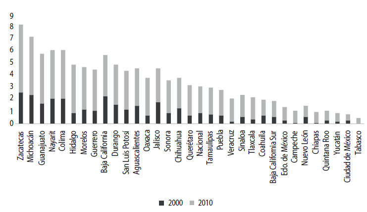 Este índice muestra una composición más completa de las viviendas mexicanas que están expuestas a la migración internacional y divide el territorio mexicano en cuatro regiones: Tradicional, Norte, Centro y Sur-sur- este.3 Si bien este producto no alcanza a perfilar la población menor de edad, sí permite generar un panorama amplio de la situación mexicana. En la Gráfica 3 se muestra el porcentaje de viviendas con migrantes de retorno por cada estado, los cuales se encuentran ordenados de forma descendente, tomando en cuenta el porcentaje de viviendas con migrantes de retorno en el año 2010. Para el último índice, el porcentaje nacional de viviendas con este tipo de migrantes fue de 2.2%, muy superior al 0.9% registrado en 2000. Asimismo, todas las entidades del país reflejaron un incremento, en términos absolutos, mucho mayor en el año 2000. Las cinco entidades con mayor porcentaje de viviendas pertenecen a la región Tradicional: Zacatecas (de 2.6 a 5.6%), Michoacán (de 2.4 a 4.8%), Guanajuato (de 1.7 a 4.1%), Nayarit y Colima (ambas de 2.1 a 4%); y dos estados correspondientes a la región Centro: Hidalgo (de 0.9 a 4%) y Morelos (de 1.2 a 3.5%) (Conapo, 2011).