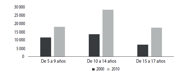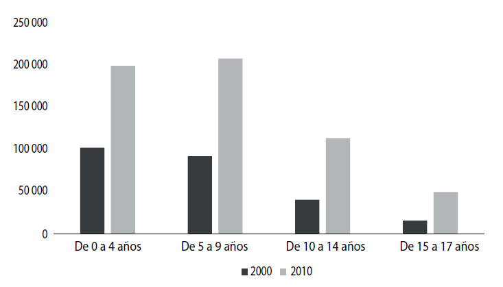 Como bien señaló Rubén Rumbaut, la edad importa mucho en el momento de migrar internacionalmente; además, la población de más de 570 mil menores de edad de nacionalidad estadounidense se compone principalmente por un contingente que se ubica en los primeros años de la primera infancia. En la Gráfica 4 se observa un comparativo en la población de 0 a 17 años nacida en Estados Unidos que llegó al país en 2000 y 2010. Para este último año, el grupo de menores con edad escolar de primero a cuarto grado de primaria constituye el bloque más extenso, con más de 208 mil niñas y niños; muy cerca de este grupo está el de los pequeños que no se encuentran en edad escolar; el tercer grupo, con casi 114 mil personas, es el de los de 10 a 14 años; y finalmente, en menor cantidad, el grupo de 15 a 17 años.