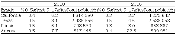 En el Cuadro 1 se muestra la cantidad total de población mexicana en los cuatro estados mencionados, así como el porcentaje de los grupos etarios de 0 a 5 años y de 5 a 17 años, y sus cambios en 2010 y 2016. El primer grupo muestra una ligera disminución porcentual en todos los estados, lo cual puede significar que, para estos estados, la intensidad de la inmigración se ha mantenido constante o ha disminuido muy poco. Sin embargo, el segundo grupo, aquel que corresponde a los niños y adolescentes en edad escolar, disminuyó en California, Texas e Illinois casi 50% entre ambas muestras. Por el contrario, Arizona es el que muestra un incremento significativo, de 7.7% en 2010 a 22.3% en 2016, lo que significa que tiene una población mexicana mucho más joven que en los años anteriores por tres posibles razones: emigraron más adultos que niños y adolescentes, inmigraron al estado más menores de este grupo de edad, o una combinación de las dos primeras.