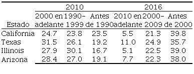 Para estos mismos estados, el tiempo de residencia del total de su población mexicana ha seguido las mismas tendencias nacionales de llegada y asentamiento en Estados Unidos. Para el año 2010, California era el estado con la población mexicana más antigua que el resto de las entidades mencionadas, pero mostraba un ligero incremento porcentual entre sus emigrantes más recientes (de 2 000 en adelante) y los de mayor antigüedad (entre los 10 y 20 años). En comparación, Texas se presentó como el estado con emigrantes más recientes en su llegada a Estados Unidos. Sin embargo, el panorama para 2016 evidencia un cambio rotundo en los asentamientos mexicanos en estos cuatro estados. California se mantiene como la entidad con una población más antigua, pero con uno de los flujos de llegada menos grandes. El caso de Arizona sobresale del resto porque, a diferencia de hace seis años, muestra asentamientos más antiguos que los que reportó en el censo de 2010 (U.S. Census Bureau, 2010; 2016). En corto, estos cambios en el asentamiento de la población mexicana en los estados de mayor recepción migrante revelan no sólo lo que Zúñiga y Hernández-León (2005) denominaron como “los nuevos destinos de la migración” (una dispersión geográfica más extendida y diversa en Estados Unidos), sino también supone una serie de cambios en la estructura demográfica de esas entidades.
