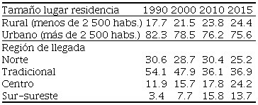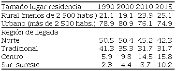 Ahora bien, el Conapo registró que los principales cinco estados receptores de migrantes internacionales se encontraban en la región Tradicional; sin embargo, el lugar de origen de sus padres no corresponde a tales estados ni a dicha región. Tal como se muestra en el Cuadro 4, la dispersión geográfica de los menores nacidos en Estados Unidos se incrementa conforme pasan los años. Así, en 25 años, la región Norte se mantiene como la principal región receptora para 2015, pero disminuye en cada año registrado, y aun cuando el porcentaje de origen es menor para las regiones Centro y Sur-sur- este, el incremento, con respecto a las décadas anteriores, es notable porque estudios previos han identificado que los lugares de destino de retorno no siempre son los mismos lugares de origen de estos migrantes (Zúñiga y Hernández-León, 2005). De igual manera, la dispersión no sólo se manifiesta en las regiones delimitadas geopolíticamente, sino también en el crecimiento de las poblaciones que representan la ruralidad o la urbanidad de los lugares de residencia de los menores migrantes internacionales. La tendencia es contundente: incluso cuando el lugar de residencia es menor a los 2 500 habitantes para el 25.1% de los estadounidenses entre los 6 y 17 años de edad, estos niños y adolescentes están llegando cada vez más a localidades rurales.