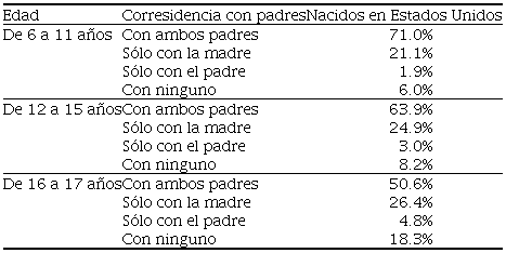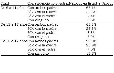 También la corresidencia del hogar revela algunas de las composiciones familiares en las que se configuran las familias mexicanas con hijos nacidos en Estados Unidos. Por ejemplo, para la población entre 6 y 17 años es más común encontrar a estos menores migrantes residiendo con ambos padres, pero cuando viven con uno de los dos, el porcentaje de menores que viven únicamente con la madre es muy superior en todos los grupos de edad. Como en el caso de Flor, aun cuando estuvo viviendo unos meses en México, ella compartió su residencia con su madre, mientras que su padre siguió viviendo en Estados Unidos. Esto es, para los nacidos en Estados Unidos, si tienen una red familiar robusta y extendida entre ambos países, la movilidad transnacional a futuro es mucho más sencilla de realizar que para los menores nacidos en México. Sin embargo, el caso de Flor es singular porque ella vivió con su madre en México y luego retornó a Estados Unidos para vivir con su padre, lo cual no representa la totalidad de la conformación de las familias de niños y adolescentes estadounidenses en México, como se muestra en el Cuadro 4.