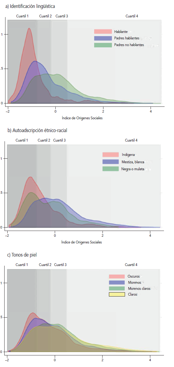 Las personas hablantes de lenguas indígenas, autoadscritas como indígenas y con tonos oscuros de piel provienen de familias con mayores desventajas educativas, ocupacionales y económicas. En particular, sobresale la dimensión lingüística como la de mayor desigualdad en los orígenes socioeconómicos familiares. La distribución de personas hablantes de lenguas indígenas en el cuartil socioeconómico menos privilegiado es desproporcionadamente mayor que la del resto de las categorías en esa y las demás dimensiones. Asimismo, las disparidades entre hablantes e hijos de hablantes sugieren que la transmisión intergeneracional de la lengua indígena está vinculada a las condiciones socioeconómicas de los padres: en la medida en que éstas son más aventajadas, menor es la probabilidad de que sus hijos sean hablantes, y viceversa.