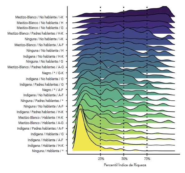 En contraste, las personas que se autoadscriben como mestizas o blancas, que no son hablantes ni tienen padres hablantes de lenguas indígenas, son quienes presentan las distribuciones con valores más positivos, tendencia que se acentúa entre quienes tienen los tonos de piel más claros (I-K). En general, se percibe que las tres dimensiones marcan diferencias importantes en los destinos económicos, en gradientes que apuntan hacia una mayor desventaja para quienes poseen rasgos étnico-raciales más afines con la identificación con pueblos indígenas o afrodescendientes.