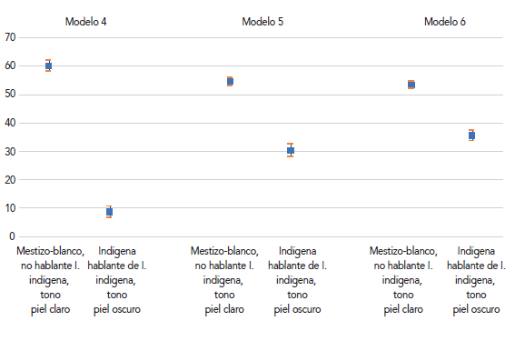 En el primer modelo, la diferencia estimada del percentil promedio entre mestizos o blancos, no hablantes de lenguas indígenas, con tonos claros de piel, y los autoadscritos como indígenas, hablantes de lenguas indígenas, con tonos oscuros de piel, es de 50 puntos. Como muestra el siguiente modelo, la brecha entre las posiciones económicas estimadas de ambos perfiles disminuye al igualar a niveles promedio los orígenes sociales, aunque sigue siendo significativa: se estima un percentil promedio de 54 para el primer perfil versus uno de 30 para el segundo, es decir, 24 puntos de diferencia. Finalmente, en el último modelo se muestra que, al igualar los años de escolaridad, las brechas disminuyen (18 puntos de diferencia), aunque éstas siguen siendo de una magnitud considerable. A partir de estos resultados, constatamos que la desigualdad étnico-racial en los destinos económicos se asocia de manera significativa por las desventajas acumuladas de generaciones anteriores, pero también a la persistencia del racismo y la discriminación del presente.
