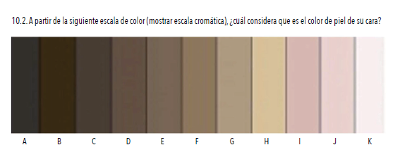 Finalmente, para la dimensión de tono de piel usamos la pregunta 10.2, donde se les pide a los entrevistados identificar el color de piel de su cara a partir de la escala PERLA (Proyecto sobre Etnicidad y Raza en Latinoamérica) (véase el Anexo). Esta escala cromática cuenta con once opciones de respuesta que van de la letra A a la K. Con base en éstas, y tratando de buscar proporcionalidad entre los subgrupos, reorganizamos la variable en cuatro categorías: oscuro (A-F), moreno (G), moreno claro (H) y claro (I-K).
