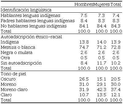 Construimos una variable nominal por cada una de las tres características étnico-raciales incluidas en el cuestionario. En el caso de la identificación lingüística, adoptamos tres categorías según el manejo de lengua indígena del entrevistado o sus padres: 1) las personas sin padres hablantes de lenguas indígenas (no hablantes); 2) las personas no hablantes de lenguas indígenas, pero con padres hablantes (padres hablantes); y 3) las personas hablantes de lenguas indígenas (hablantes).