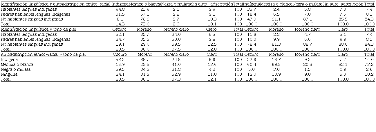 La autoadscripción étnico-racial también presenta una asociación moderada con el tono de piel. Las personas que se autoadscriben como negras o mulatas sistemáticamente se ubican en los tonos de piel más oscuros: 39.5% en la categoría de tono oscuro y 34.5% en la de moreno; le siguen de cerca las personas que se autoadscriben como indígenas (33.2 y 35.7%); en contraste, las personas mestizas o blancas tienen menores porcentajes en estas categorías (16.9 y 28.5%, respectivamente), y mucha mayor concentración en la categoría de moreno claro (41.0%) y claro (13.6%).