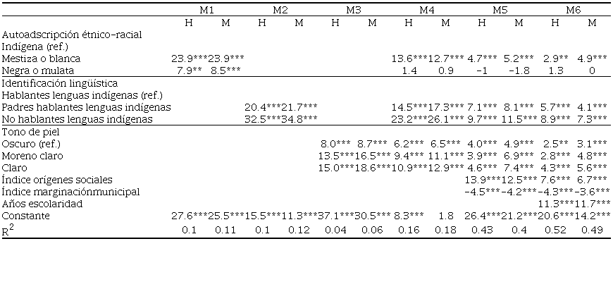 Debido a que el índice de activos económicos (IAE) es una variable continua, optamos por utilizar modelos de regresión lineal múltiple.5 Ajustamos un total de seis modelos, por separado para hombres y mujeres. Los modelos 1 a 3 incluyen individualmente a cada una de las características étnico-raciales, además de controles básicos por edad y situación conyugal. Esto permite realizar una primera evaluación de la relación bivariada entre cada característica en lo individual y los destinos económicos. El modelo 4 incluye simultáneamente las tres variables étnico-raciales, lo cual permite evaluar su efecto individual una vez que se controlan las otras dimensiones étnico-raciales. El modelo 5 introduce las dos variables de orígenes socioeconómicos, lo que permite identificar la magnitud del efecto de las características étnico-raciales que es atribuible a su asociación con las condiciones socioeconómicas familiares y geográficas de origen. Finalmente, el modelo 6 incluye, además de las variables anteriores, los años de escolaridad. El contraste de los coeficientes de los modelos 5 y 6 indica en qué medida la asociación entre las características étnico-raciales y los destinos económicos se explica por la desigualdad de las oportunidades educativas.
