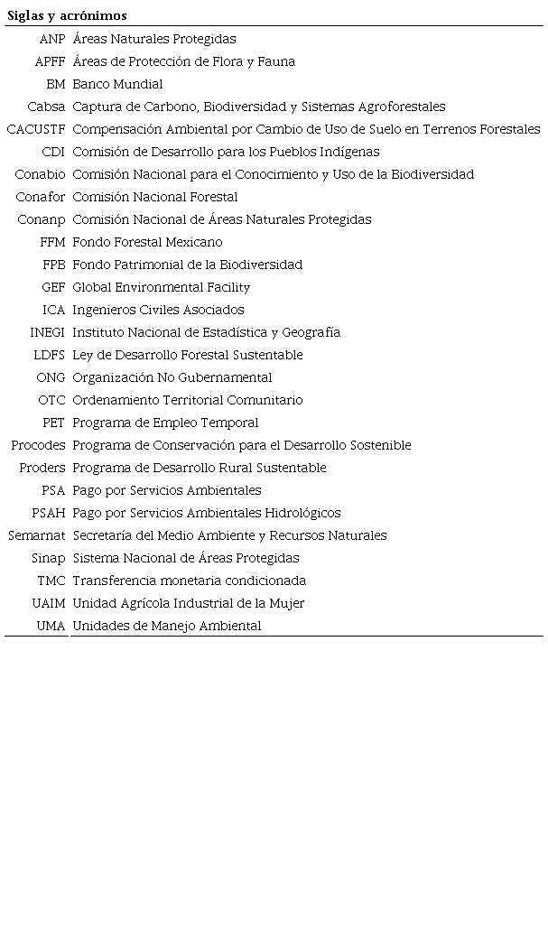 Asimismo, se han hecho pocos desagregados sobre la variabilidad de los modelos de gobernanza ambiental.1 Sin embargo, para el caso de los servicios ambientales del bosque, se ha dado un seguimiento a las variaciones que el Estado ha diseñado en los instrumentos de esta política sectorial. No obstante, los contenidos subyacentes del esquema y el ejercicio de poder en su implantación no siempre han sido interpelados (un ejemplo de esto son los estudios de Perevochtichikova, 2014b; 2016).