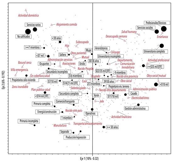 a) Los principales ejes de las desigualdades sociales en Posadas involucran al volumen global de capital, a la inserción ocupacional y a las trayectorias sociales. En el primer eje destacan los aportes del capital económico (ingresos económico individual y familiar total), el carácter y cualificación ocupacional, y el capital cultural (nivel educativo); las oposiciones fundamentales se dan entre los capitalizados (los que más tienen en general) y los desposeídos (los que menos tienen en general). En el segundo eje, los aportes más fuertes provienen del carácter y cualificación ocupacional, la edad, el estado civil, el nivel educativo y el sexo; las posiciones más diferenciadas corresponden a los operativos, varones, de la rama de comercio y transporte, producción y reparación [...] y a los profesionales o técnicos, empleados en servicios sociales, servicios varios, mujeres [...]. En el tercer eje destacan las generaciones temporales, la cantidad de miembros del hogar, el nivel educativo, el estado civil y la edad. De una parte, aquellos con 30 años o menos, en hogares con cinco o seis miembros, trabajando en gestión administrativa y con secundaria completa; y de otra parte, las generaciones mayores: con 50 años o más, en hogares con sólo un miembro, separados, con ingresos familiares totales de $14 mil o menos, y empleado en servicios sociales [...].