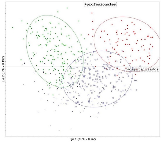 Con los datos de los miembros activos (miembros seleccionados) se realiza un análisis de correspondencias múltiples (ACM) especifico, seguido de una clasificación ascendente jerárquica (CAJ) para el agrupamiento de los miembros en clases. En ciencias sociales estas técnicas de análisis se asocian al trabajo de Bourdieu y al análisis geométrico de datos (Le Roux y Rouanet, 2004; Robson y Sanders, 2009; Bourdieu, 1988). Las principales fortalezas de estos análisis incluyen: el descubrimiento y la exposición visual de relaciones de fuerzas; la exposición de homologías estructurales entre múltiples dimensiones (campos) como la economía, la política y la cultura; la explicación de tomas de posición y luchas entre individuos y clases -sobre todo cuando se incorporan análisis cualitativos en profundidad-; y la identificación de dinámicas sociales, especialmente utilizando técnicas de clasificación (Lebaron, 2009; Hjellbrekke et al., 2007).