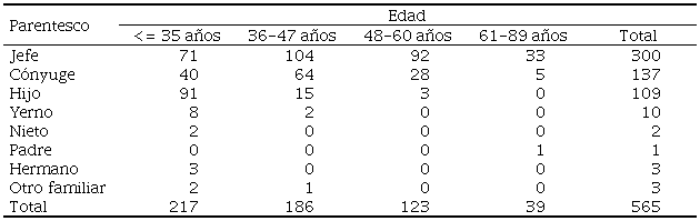 Los 565 miembros activos (de 1 449 individuos) incluyen principalmente a jefes de hogares, cónyuges e hijos; los primeros mayormente con edades de 36 a 47 años y de 48 a 60 años; los segundos, de 36 a 47 años y 35 años o menos; y los terceros, en general con 35 años o menos (Cuadro 1).
