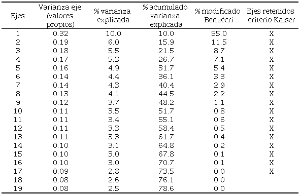 El ACM específico considera 10 variables con 34 categorías activas y 9 variables suplementarias con categorías pasivas; las categorías con bajas frecuencias fueron removidas siguiendo la “regla del 5%” (Le Roux y Rouanet, 2010, p. 216). El primer eje describe el 55% de la inercia total según el porcentaje modificado de Benzécri, aunque hay variaciones importantes en el segundo (11.5%) y tercer eje (8.7%) (Cuadro 2). De manera que se retoma la lectura de estos tres primeros ejes, responsables del 75.2% de la inercia total.