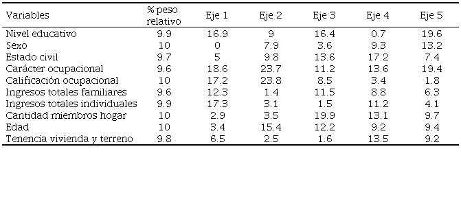 Una característica central del ACM es que no presupone la existencia de variables causales o independientes; más bien, expone la estructura de fuerzas entre propiedades e individuos, permitiendo la superposición de categorías suplementarias sobre esta estructura. La descripción del análisis se basa en la lectura de coordenadas, contribuciones, cosenos y pesos de las categorías, así como de valores propios, además de la representación geométrica de los resultados (Rouanet, Ackermann y Le Roux, 2000; Le Roux y Rouanet, 2004). Para el ACM se consideran las siguientes variables activas: la edad, el sexo, el estado civil, el nivel educativo alcanzado, la calificación y el carácter ocupacional, el monto total de ingresos económicos individuales, el monto total del ingreso familiar, la tenencia de vivienda y terreno, y la cantidad de miembros de hogar (Cuadro 3). A las variables menos definitivas se las considera variables suplementarias, en este caso: tipo de vivienda, ubicación de la vivienda (cerca de basurales o en villa emergencia), lugar de procedencia, cobertura de salud, alfabetismo, intensidad de ocupación, relación de parentesco, tipo de trabajo, y rama de la producción.