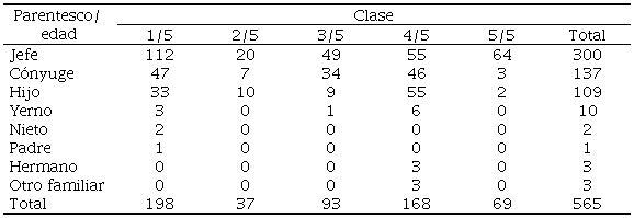 Como se había adelantado al principio, en términos de relaciones de parentesco y cantidad de miembros activos dentro del hogar, las estructuras de las clases son disímiles (Cuadro 4). Basta detenerse en la figura del jefe de hogar. Si bien éstos son los más numerosos entre los miembros activos, la participación de cónyuges, hijos, yernos y demás, son más importantes en unas clases que en otras.