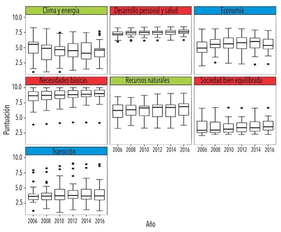 En primer lugar, se realizó un análisis descriptivo y gráfico del SSI para observar su distribución. En la Figura 2 se muestra el diagrama de cajas de cada una de las categorías para los periodos 2006 a 2016 para todos los países estudiados. Se han coloreado considerando la categoría: verde para “clima y energía” y “recursos naturales”, rojo para “desarrollo personal y salud”, “necesidades básicas” y “sociedad bien equilibrada”; de igual manera, en color azul se consideraron las categorías “economía” y “transición”, observando que existen diferencias entre ellas.