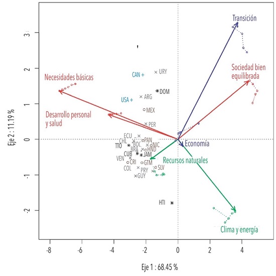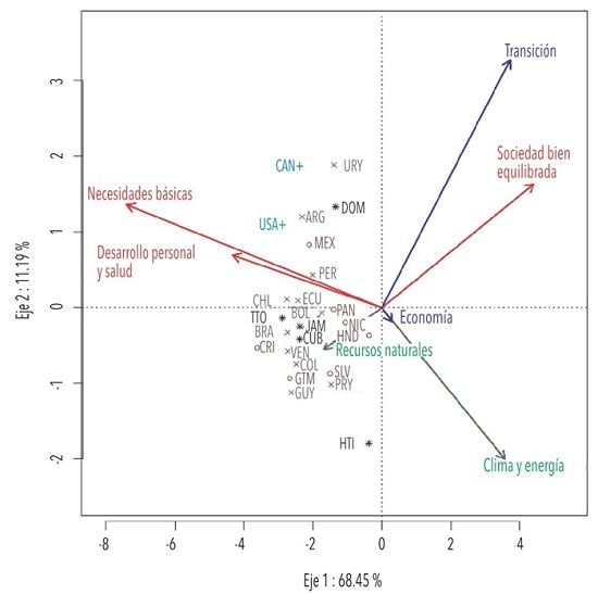En la Figura 3, los ejes 1-2 explican el 79.64% de la variabilidad; por otro lado, se observa que necesidades básicas y desarrollo personal y salud se encuentran bien correlacionadas, aunque también se ve correlación entre transición y sociedad bien equilibrada. Con respecto al índice de necesidades básicas, que tiene relación con suficiente comida, suficiente agua y saneamiento seguro, y la variable desarrollo personal y salud, es posible observar que países como CAN y USA presenten los valores más altos en el mencionado índice; en contraste encontramos a HTI.