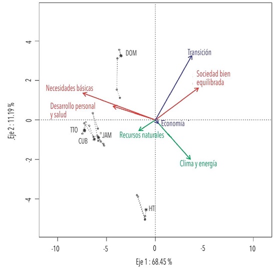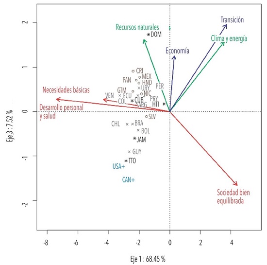 Para el eje 1-3 (Figura 4), existe una correlación entre necesidades básicas y desarrollo personal y salud; también se ve correlación para transición, clima y energía. En cuanto a la relación que existe entre las variables y los países, se puede ver que DOM está relacionada con el índice de recursos naturales, que conlleva a biodiversidad, recursos de agua renovables y consumo.