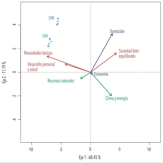 La Figura 6 muestra el análisis para Norteamérica, donde se observa que los países que forman parte de esta región (CAN y USA) están muy relacionados a las variables desarrollo personal y salud, al igual que las necesidades básicas, lo cual conlleva a pensar que durante los años 2006 a 2016 existe una trayectoria con un ligero incremento en mejora de distribución de ingresos, crecimiento de la población, buen gobierno, suficiente comida, suficiente agua y saneamiento seguro.