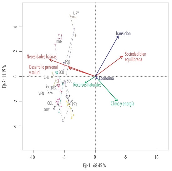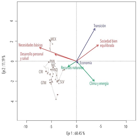 Como se mencionó en la metodología, la interpretación de las variables se basa en los ángulos entre los vectores, de tal modo que las variables con vectores que forman ángulos pequeños son variables con similares comportamientos. En la Figura 3 (ejes 1-2) se observa fuerte correlación positiva entre las variables necesidades básicas, desarrollo personal y salud; una correlación positiva moderada entre transición y sociedad bien equilibrada; correlación negativa entre clima y energía, y las variables transición, necesidades básicas y desarrollo personal y salud; mientras que son independientes clima y energía con recursos naturales y con sociedad bien equilibrada. No obstante, es necesario indicar que esta situación podría estar influenciada por el hecho de que las variables economía y recursos naturales no se encuentran bien representadas en el eje 1-2.